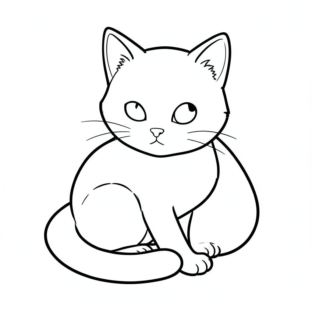A cat sits attentively, its tail curled around its paws. A simple, slightly tilted head rests on its paws, gazing towards the viewer. A small, delicate paw rests on the ground., black and white coloring page, lowbook style, line art, monochrome, uncolored, no shading, no grey, no fill, white background, solid black outlines, bold contrast, crisp lines, outline only, vector style, flat design, 2d, exactly one single tail, absolutely no black fill, pure white interior, no ink patches, no text, no words, no titles, absolutely no color, pure black and white lineart only