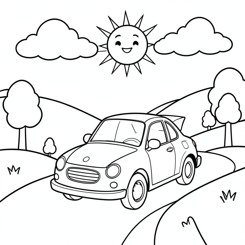 A cheerful car cruises along a winding road. Fluffy clouds drift in a sky above, and a smiling sun peeks from behind them. Gentle rolling hills form the backdrop, dotted with simple, stylized trees. The car has one clearly defined head, a single body, and one tail fin. The interior of the car is white. Clean lines define the shape of the car and the surrounding landscape. The composition is balanced, with the car positioned slightly off-center to create visual interest., coloring page, line art, white background
