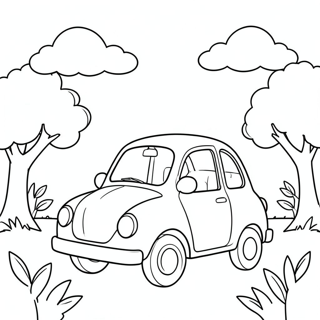 A cheerful car with a simple rounded body sits peacefully in a sunny garden. The car has one clean head with two small circular windows, one body section, and one tail with a tiny rear . Soft white clouds float above in the clear sky. A few gentle leaves sway on nearby trees. The car's wheels are simple circles, and the overall composition balances the vehicle with the sky and garden elements. The scene shows no , no color, no shadows, and no negative elements. The car sits in a peaceful, simple environment with soft lines and clean geometric shapes., coloring page, line art, white background
