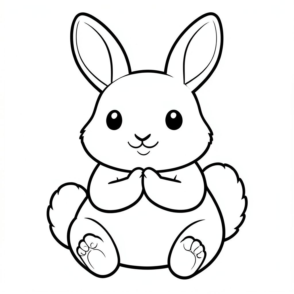 A chubby bunny with big round ears that stick up high, small eyes that are round and , a tiny nose that's just a little triangle, and a fluffy white tail that's puffy and round. The bunny has big floppy ears that are soft and cuddly, and a sweet smile with a small mouth. The body is plump and round, with tiny little feet that are and cute. The bunny's ears are long and soft, and the whole animal looks so soft and cuddly and happy. The lines are thick and bold, with no extra details, just the simple shape of a cute bunny. The bunny is sitting up on its hind legs, with its front paws together in a little prayer position, looking so sweet and innocent. The whole animal is just one single cute, chubby, friendly creature with no extra parts or details. The lines are thick and bold, with no shading or background, just the simple outline of a happy bunny. The bunny has no teeth, no claws, no extra features, just a simple, adorable, chubby face with big eyes and a cute smile. The ears are long and floppy, and the whole animal looks so soft and cuddly and happy. The lines are thick and bold, with no extra details, just the simple shape of a cute bunny. The bunny is sitting up on its hind legs, with its front paws together in a little prayer position, looking so sweet and innocent. The whole animal is just one single cute, chubby, friendly creature with no extra parts or details. The lines are thick and bold, with no shading or background, just the simple outline of a happy bunny. The bunny has no teeth, no claws, no extra features, just a simple, adorable, chubby face with big eyes and a cute smile. The ears are long and floppy, and the whole animal looks so soft and cuddly and happy., coloring page, line art, white background