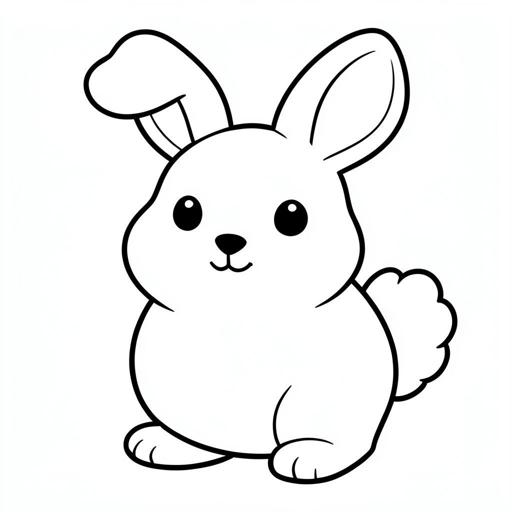 A chubby round bunny with big floppy ears, small eyes, and a tiny nose. The bunny has a cute smile and a fluffy tail. All lines are thick and bold with no outlines. The entire image is white with no shading or color. Simple and adorable., coloring page, line art, white background