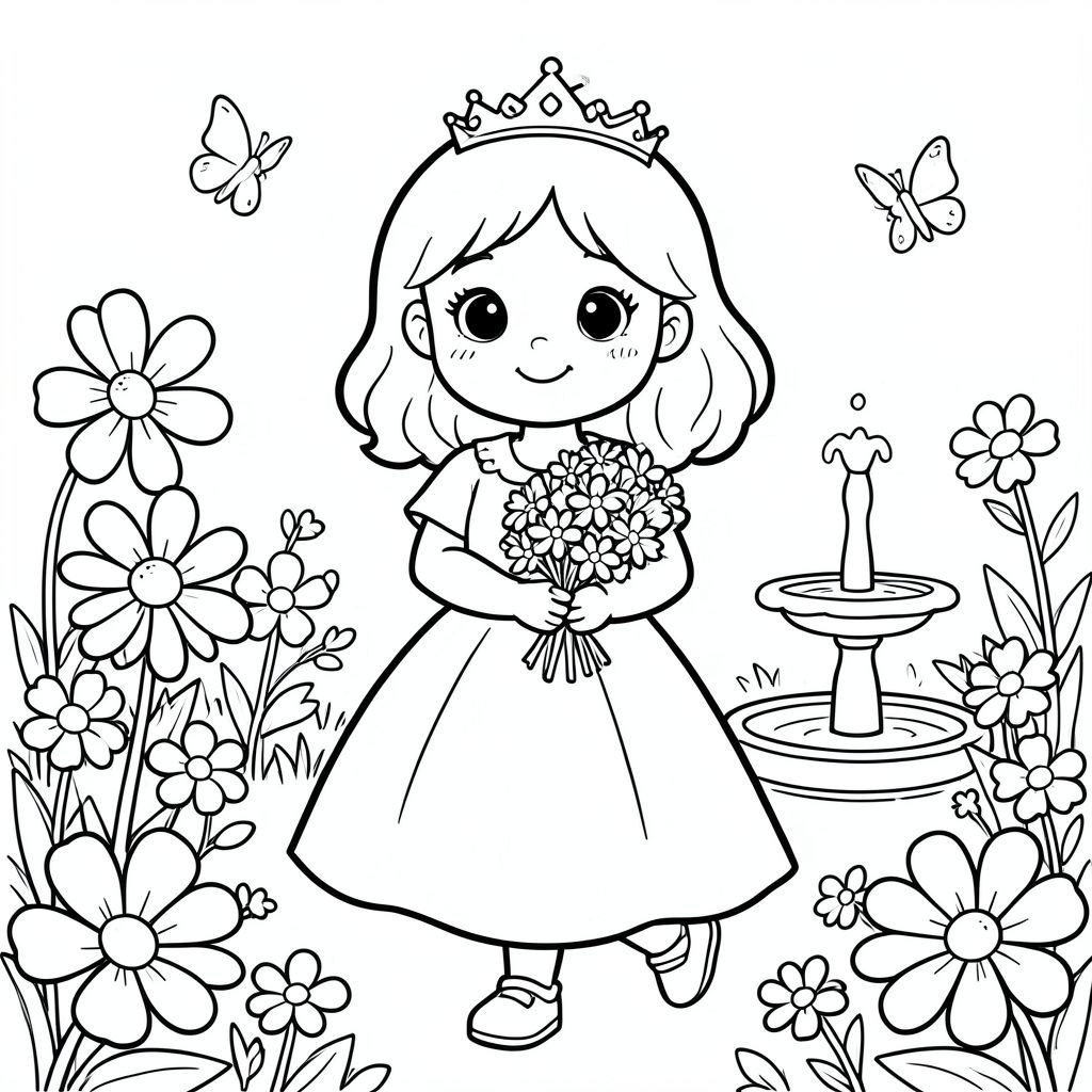 A cute 7-year-old princess girl with round friendly face, big expressive eyes, small nose, gentle smile, medium-length wavy hair with a simple crown. She is walking in a magical garden filled with large simple flowers, butterflies, and a small fountain. She is holding a flower bouquet.