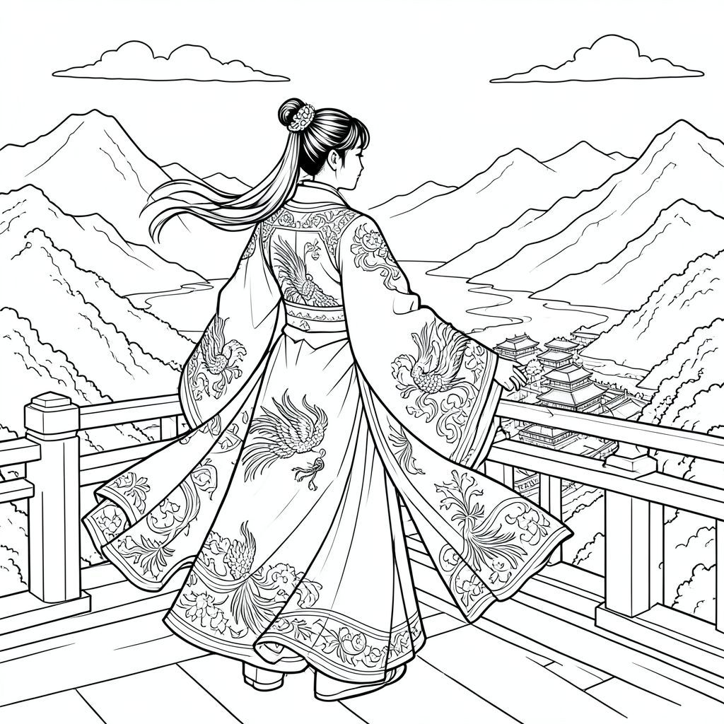A full-page scene of a majestic Empress turned away standing on a palace balcony wearing an elaborate flowing hanfu with long embroidered sleeves, phoenix patterns, layered silk, wind blowing dramatically, overlooking her vast kingdom of mountains and rivers.
