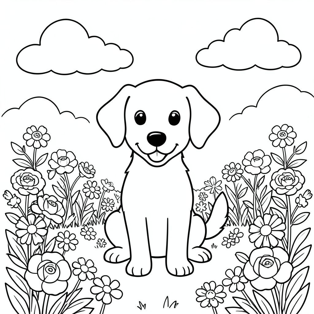 A happy dog sits in a sunny garden filled with blooming flowers. Fluffy clouds drift across a sky above. The dog has floppy ears, a wagging tail, and a friendly expression. Simple lines define the petals of the flowers and the gentle curves of the clouds. The composition is balanced, with the dog centered amidst the peaceful garden scene., coloring page, line art, white background
