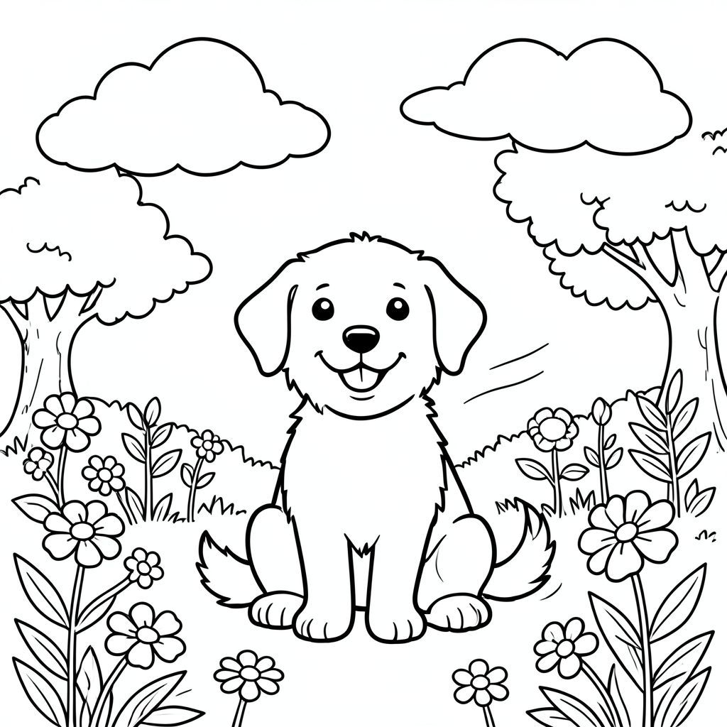 A happy dog sits in a sunny garden. Fluffy clouds drift in the sky above. Simple flowers bloom around the dog, and a gentle breeze rustles through the leaves of nearby trees. The dog is outlined in clean, bold lines, perfect for coloring., coloring page, line art, white background