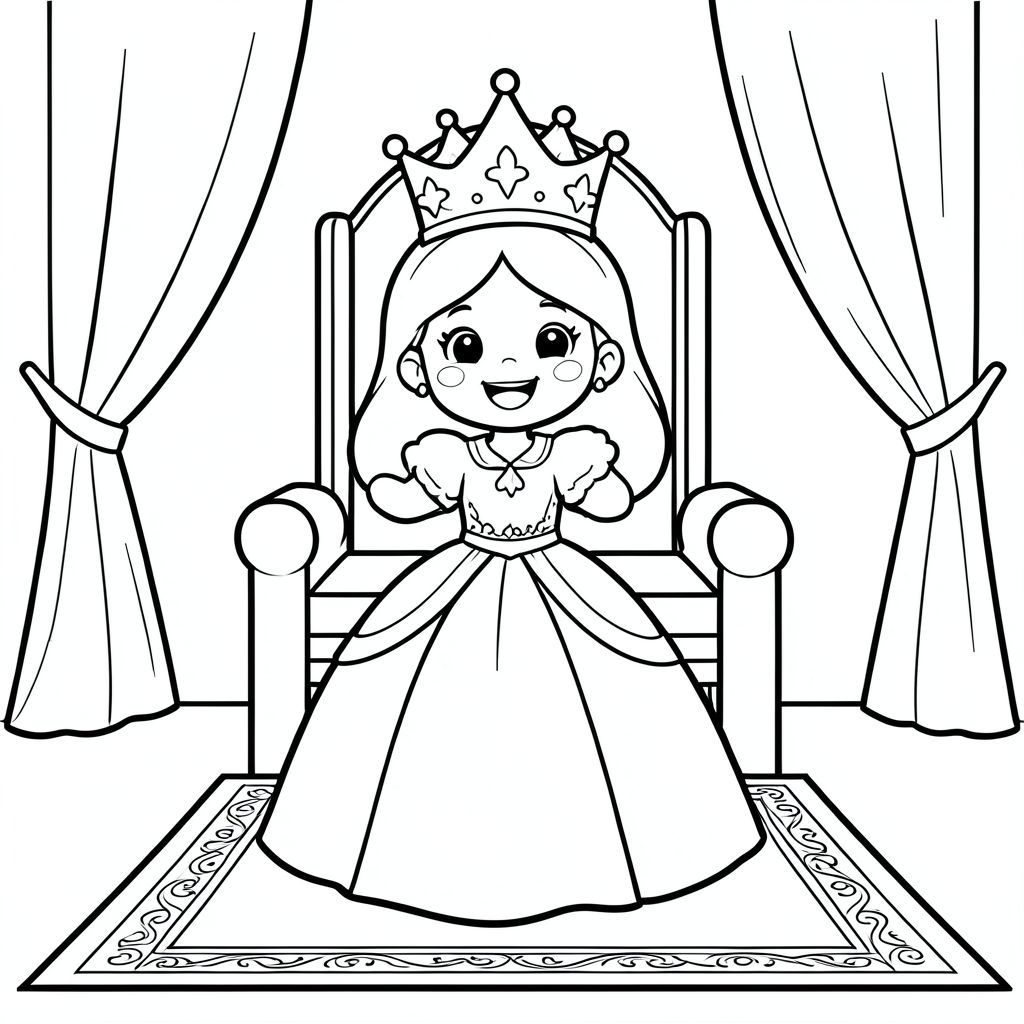 A joyful princess being gently crowned with a shiny crown during a ceremony. Simple throne room background with curtains and a royal carpet.