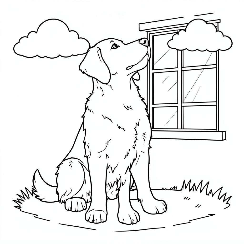 A large Retriever sits on a patch of grass, its head raised, front paws resting on the ground. The background features a simple silhouette of a window with sunlight streaming through, and fluffy white clouds in the sky. The dog's outline is clear and detailed, with four legs and a single tail. The scene is peaceful and cheerful, with no other elements or ., coloring page, line art, white background