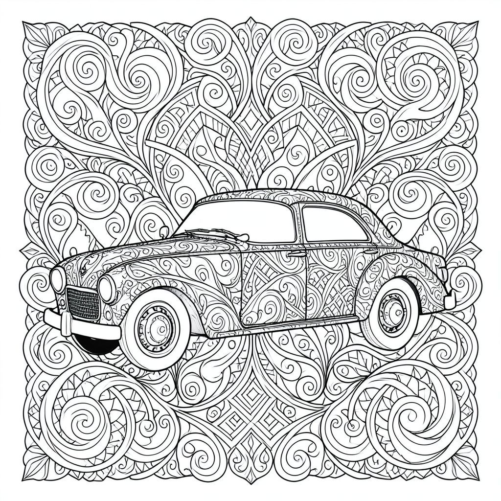 A mesmerizing, full- zentangle design showcases the elegant silhouette of a classic car. Every inch of the explodes with intricate patterns – swirling vortexes, delicate spirals, and repeating geometric motifs, all rendered in clean, precise linework. The car's form is meticulously defined within this complex tapestry, its curves and angles echoing the rhythm of the surrounding patterns. Dense, interwoven details create a rich visual texture, demanding close inspection to fully appreciate the artistry. The background is entirely composed of these repeating, interconnected designs, offering a captivating, symmetrical experience. This is a challenging and rewarding coloring , perfect for those who enjoy complex, meditative art., coloring page, line art, white background