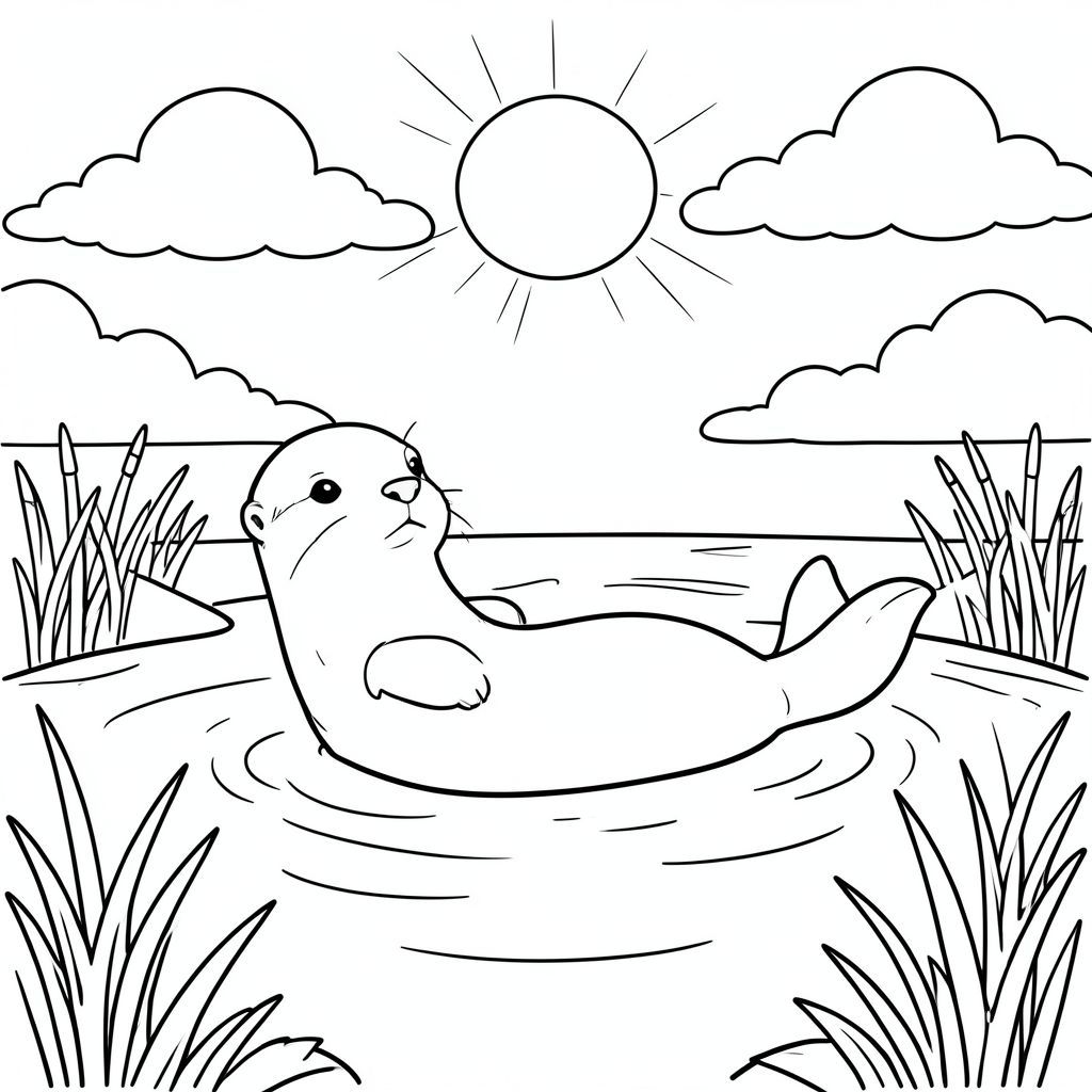 A playful otter floats on its back in a gentle stream. Soft clouds drift across a sunlit sky above. Reeds and simple riverbank plants line the edges of the water. The otter has a single head, a single body, and a single tail. Clean lines define its form, ready for coloring. Balanced composition., coloring page, line art, white background