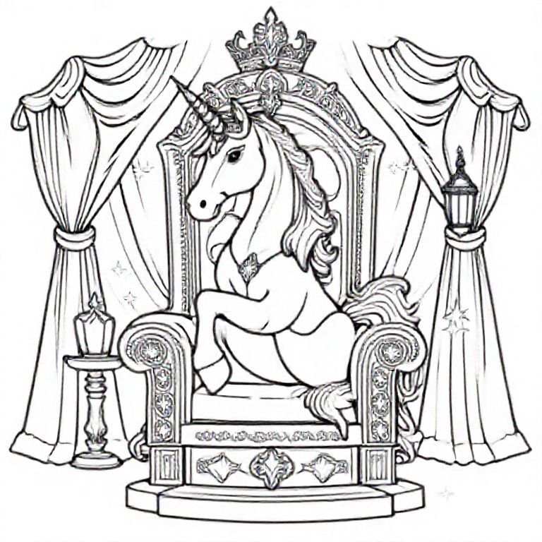 A powerful unicorn sitting on a royal throne adorned with gemstones, draped curtains behind, ornate crown, symmetrical decorations, two lanterns on each side, enchanted sparkles, clear areas for colouring large shapes.