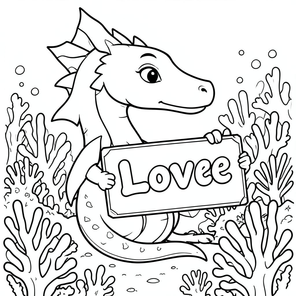 A profile view of a friendly dragon, holding a sign with "Love" written in white bubble letters, in profile, in a underwater coral reef kingdom, surrealist style