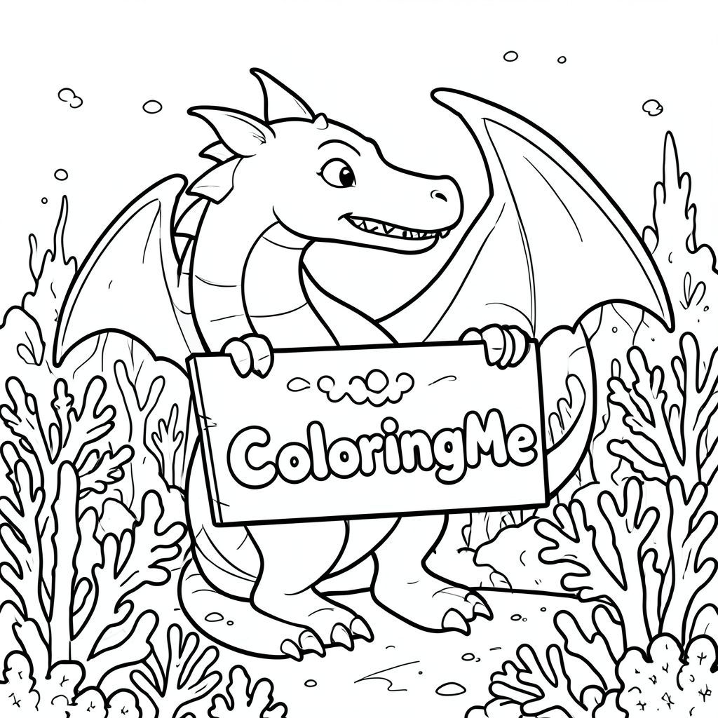 A profile view of a not friendly dragon, holding a sign with "ColoringMe" written in white bubble letters, in profile, in a underwater coral reef kingdom, surrealist style