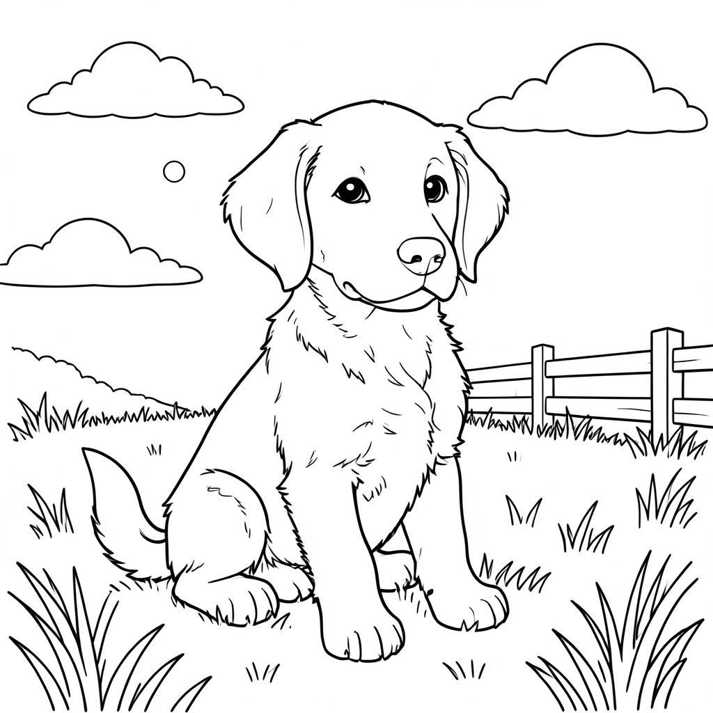 A retriever puppy sits calmly in a sunlit meadow during late afternoon. The dog's head is turned slightly toward the viewer, ears flopping gently, eyes soft and friendly. Its tail wags slowly in contentment. The scene features a sun casting gentle shadows, a few white clouds floating overhead, and grass surrounding the dog. A small wooden fence appears in the background to the right, creating a balanced composition. The puppy's fur is detailed with clean, simple lines showing the texture of its coat. The entire illustration maintains clean, unbroken lines with no shading or color, focusing purely on the singular, peaceful presence of the dog in its natural environment., coloring page, line art, white background