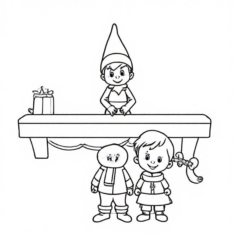 A simple black-and-white coloring page line drawing. A boy and girl Elf on the Shelf smiling while standing on a shelf. In front of the shelf are three children: a 5-year-old girl with long hair named Karsyn, a 3-year-old boy named Lincoln, and a 2-year-old little girl named Kobi. The children look happy and playful. Style is cute, child-friendly, and festive. Thick, clean outlines, no shading, no color, minimal background details. Designed specifically as a printable coloring page for young kids.