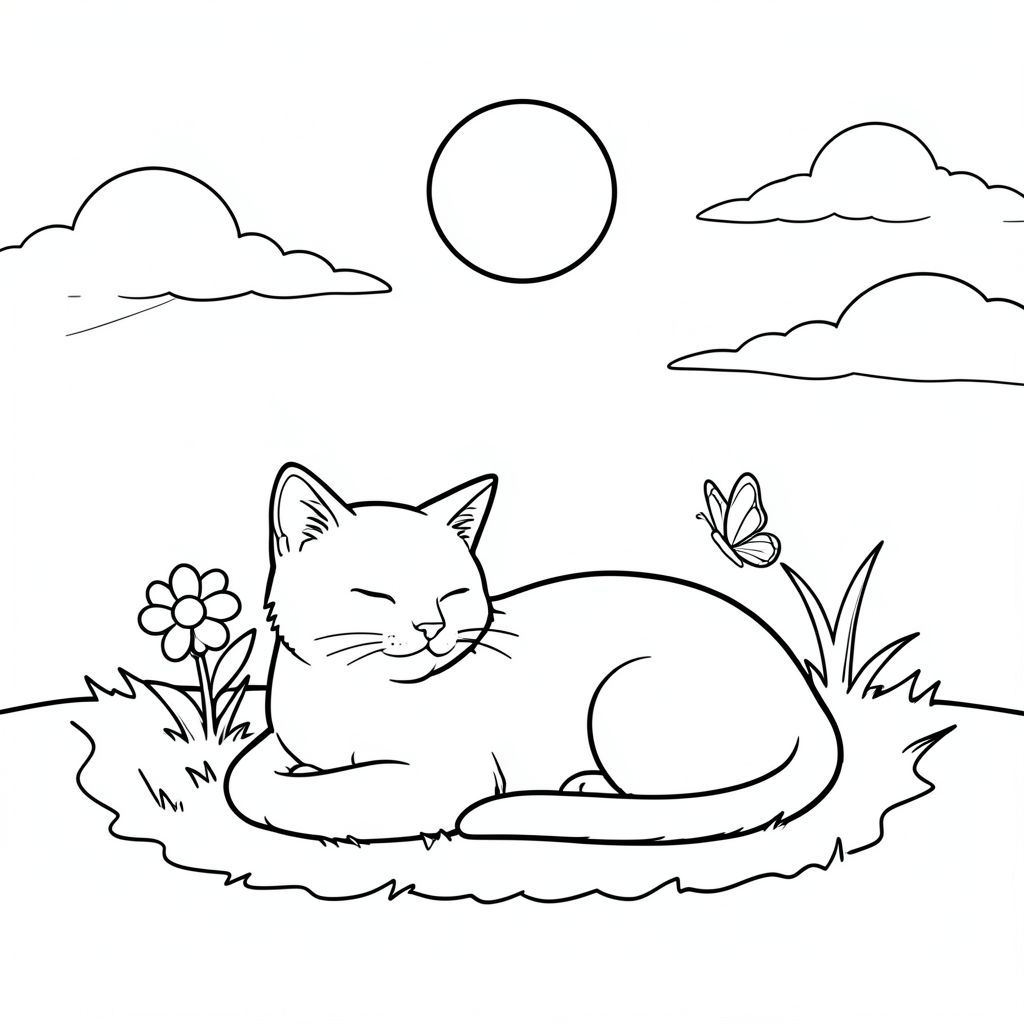 A single cat lies comfortably on a soft patch of grass in a simple garden scene. A single sun sits high in the sky, casting a gentle . Wispy clouds drift across the sky. A single flower with simple, clean lines grows near the cat's head. A single, tiny butterfly with simple wings rests on a blade of grass nearby. The composition is balanced, with the cat occupying the center of the frame. The background elements are minimal and do not distract from the subject. The lines defining the cat and the background elements are clean and clear. No appears anywhere in the scene., coloring page, line art, white background