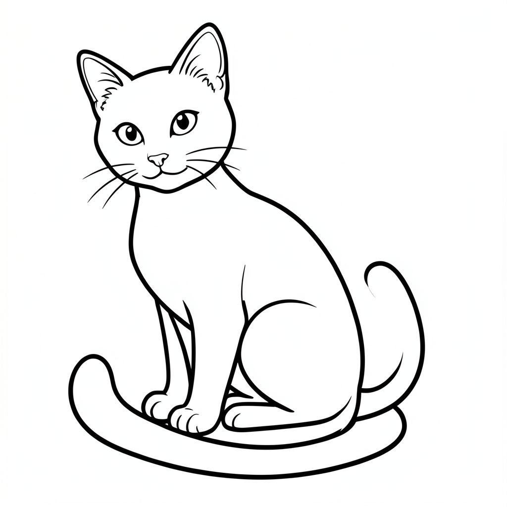 A single cat, sleek and , sits attentively. Its head is slightly tilted, gazing towards the viewer. A long, graceful tail curves gracefully behind it. The cat’s body is compact and lithe, conveying a sense of quiet stillness., black and white coloring page, lowbook style, line art, monochrome, uncolored, no shading, no grey, no fill, white background, solid black outlines, bold contrast, crisp lines, outline only, vector style, flat design, 2d, exactly one single tail, absolutely no black fill, pure white interior, no ink patches, no text, no words, no titles, absolutely no color, pure black and white lineart only