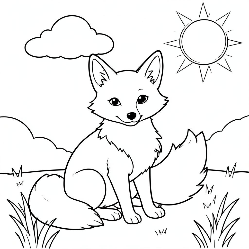 A single fox sits calmly on a sunlit meadow. The fox has a bushy tail that curves gently behind it, and its pointed ears are perked forward. The fox's body is rounded and soft, with a distinctive white chest . A small cloud floats above the fox's head, and the sun shines brightly in the upper right corner of the scene. The fox's eyes are gentle and curious, looking toward the viewer. The composition is balanced with the fox centered in the frame, surrounded by simple grass and soft sky. The fox's fur is detailed with clean, simple lines showing its natural texture. The background contains no additional elements, just the basic sun, cloud, and open sky. The fox appears content and peaceful, with no signs of distress or danger. The entire scene maintains a warm, friendly atmosphere with clean, uncluttered lines and simple shapes., coloring page, line art, white background