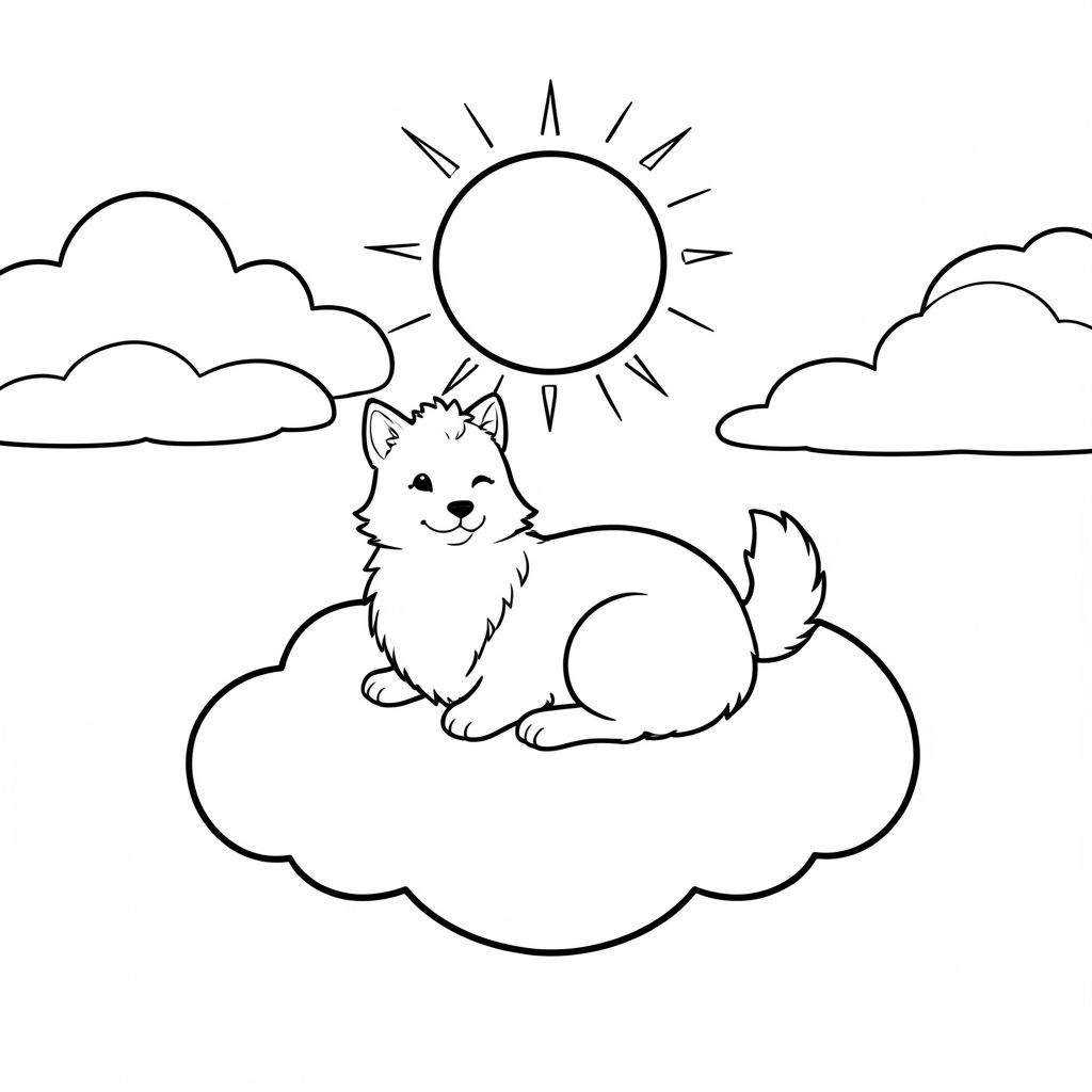 A single Jasmine sits peacefully beneath a sun, her soft fur catching the . She rests on a gentle cloud that floats above a clear sky, her body positioned in a relaxed pose with her tail curled neatly beside her. The scene features a simple, balanced composition with the Jasmine centered, surrounded by a few soft white clouds that create a calm, dreamy atmosphere. Her form is clean and simple, with no complex details or shadows, allowing her gentle presence to shine through. The background remains minimal and peaceful, focusing entirely on the serene solitude of this single, graceful creature., coloring page, line art, white background