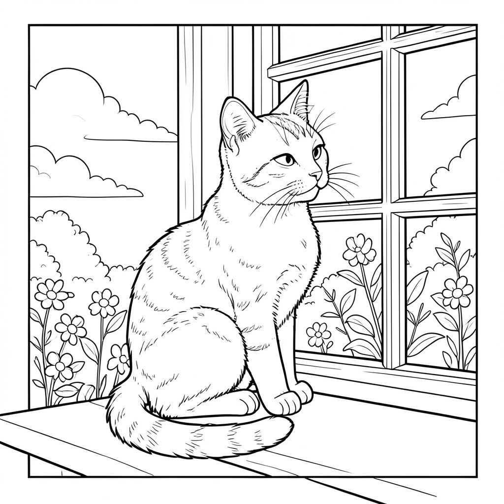 A single tabby cat sits gracefully on a windowsill, its soft fur catching the morning . The cat's head is turned slightly toward the window, ears perked forward as it watches something outside. Its tail curls elegantly around its paws, creating a gentle arc. The scene features a sunny day with soft white clouds drifting across a clear sky. A simple wooden window frame with small panes of glass surrounds the cat. The composition is balanced with the cat positioned slightly off-center, creating visual interest while maintaining the clean, simple aesthetic. The cat's eyes are half-closed in contentment, and its whiskers are delicately detailed. The background shows a peaceful garden view with a few scattered flowers and leaves visible through the window. The entire scene is rendered in clean line art with no shading or color, focusing solely on the cat's singular, realistic form., coloring page, line art, white background