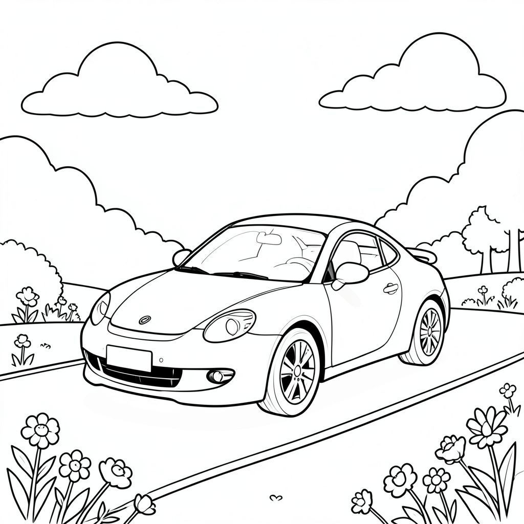 A sleek car sits peacefully on a sunlit road, its smooth curves catching the . The vehicle features a single rounded head with a white interior visible through the windshield, and a graceful tail that tapers to a point. Soft clouds drift lazily across a clear sky above, casting gentle shadows on the car's surface. The scene is framed by simple geometric elements: a few scattered flowers along the roadside and a distant tree line that creates a balanced composition. The car's clean lines are emphasized against the simple background, with no or additional details. The entire illustration maintains a cheerful, wholesome atmosphere with no or disturbing elements. The car's form is clearly defined through its single head, body, and tail structure, positioned symmetrically within the composition. A peaceful garden setting surrounds the vehicle, with soft sunlight creating a warm, inviting mood. The scene is completely devoid of any negative elements, maintaining the pure, innocent aesthetic of a traditional storybook illustration., coloring page, line art, white background