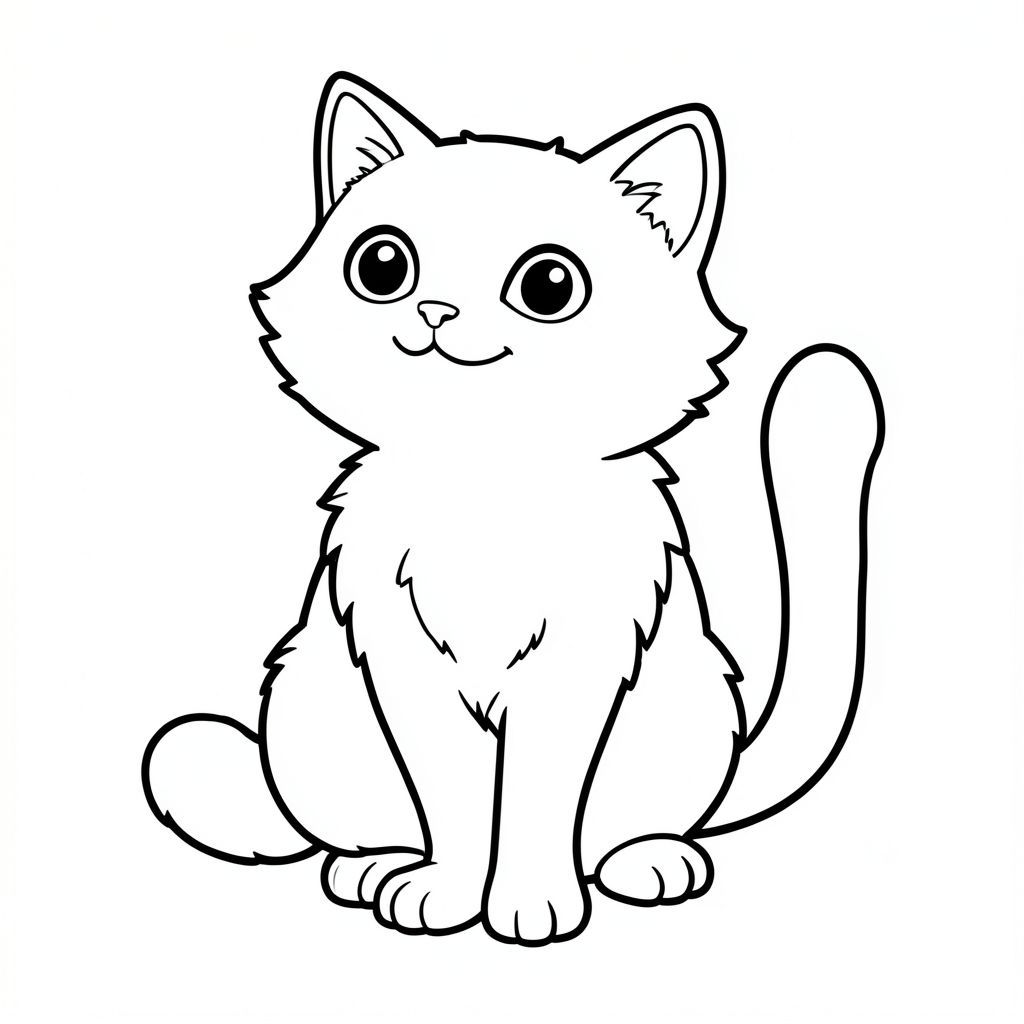 A small, fluffy cat with wide, innocent eyes sits upright. Its fur is a soft, . A single, long, white tail extends from its back, curving gracefully. The background is a simple, white. The cat’s face is slightly tilted upwards, suggesting a gentle smile., black and white coloring page, lowbook style, line art, monochrome, uncolored, no shading, no grey, no fill, white background, outline only, vector style, flat design, 2d, exactly one single tail, absolutely no black fill, pure white interior, no ink patches, no text, no words, no titles