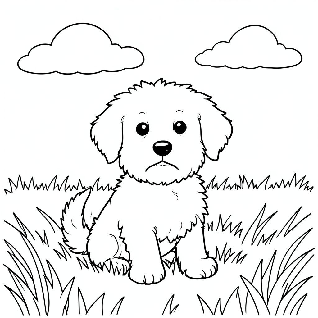 A small, fluffy dog sits in a field of sunlight. A gentle, hazy cloud drifts across the sky. The dog's head is centered, its tail gently curving downwards. The background is a soft, blurred expanse of grass. The composition is balanced, with the dog taking up a significant portion of the ., coloring page, line art, white background