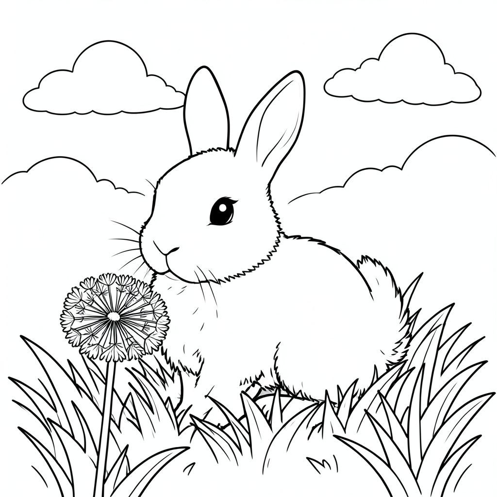 A small, fluffy white rabbit sits nestled amongst a bed of soft, grass. A single, dandelion is in the foreground, slightly blurred. The rabbit's head is centered, facing slightly to the left. Its tail is curled gently behind it. The background is a hazy, sky with a few fluffy white clouds. The composition is balanced, with the rabbit slightly off-center., coloring page, line art, white background