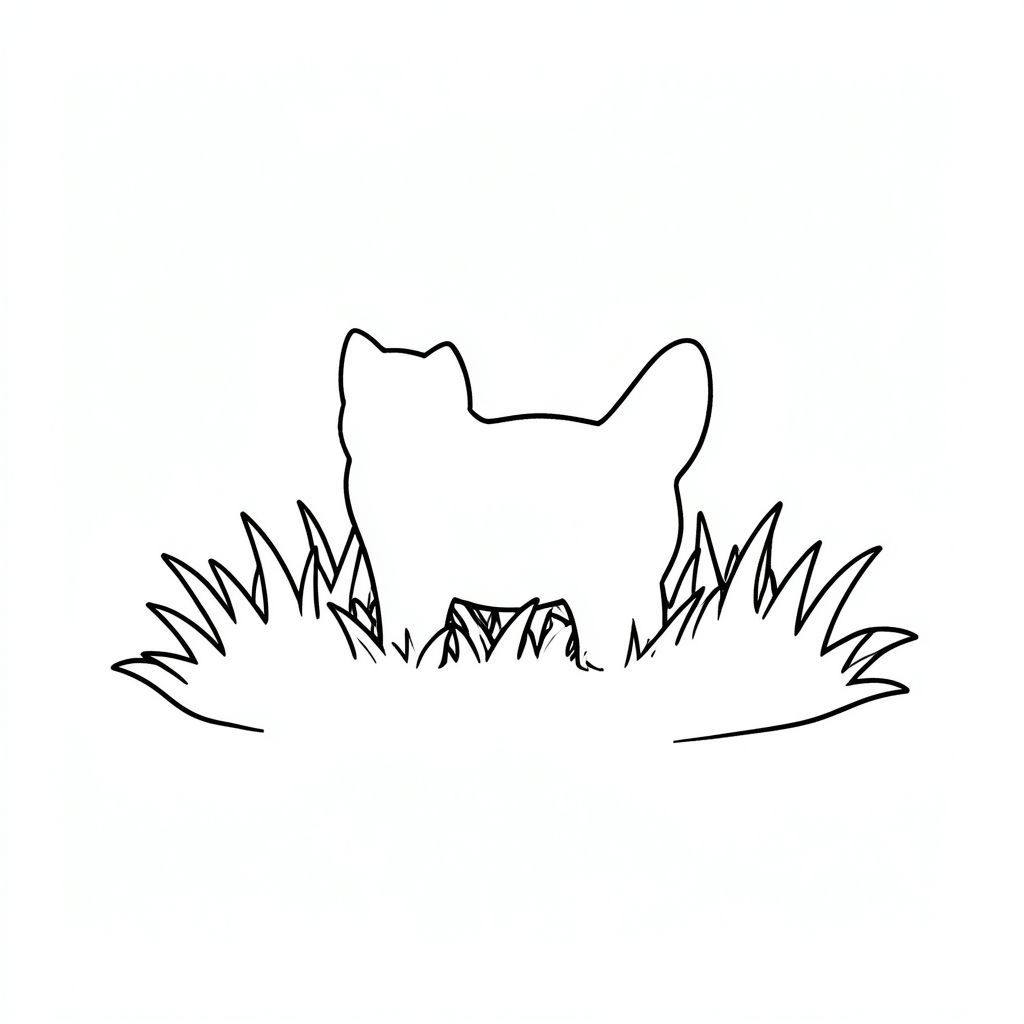 A small, sunlit patch of grass. A single, silhouette of a cat is centered. The grass is slightly blurred., coloring page, line art, white background