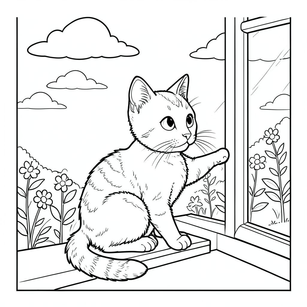 A small tabby cat sits peacefully on a windowsill, one paw gently resting on the wooden frame. The cat's head is turned slightly toward the window, ears perked forward as it watches something outside. Soft sunlight streams through the glass, casting gentle shadows across the cat's fur. Above, a few white clouds drift across a clear sky. The composition is balanced with the cat positioned slightly off-center, creating visual interest while maintaining the clean, simple aesthetic. The cat's tail curls gracefully around its body, and the entire scene is rendered in clean, bold outlines with no shading or color. A simple garden scene can be seen beyond the window, with a few flowers and leaves adding to the peaceful atmosphere. The background elements are minimal and unobtrusive, keeping focus on the single, adorable cat., coloring page, line art, white background
