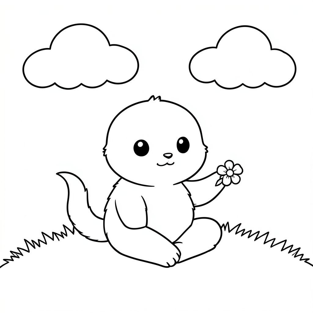 A small white jasmine creature sits peacefully on a soft grassy hill under a sunny sky. Three fluffy white clouds float gently overhead in the background. The jasmine has one round head with large gentle eyes, a small nose, and a long flowing tail that curves softly behind. Her body is perfectly round with soft white fur. She sits cross-legged with one arm resting on her knee and the other reaching toward a small flower blooming nearby. The composition balances the jasmine in the foreground with the sky and clouds in the background, creating a harmonious storybook scene. Simple clean lines define her form without any shading or . The scene radiates tranquility and innocence., coloring page, line art, white background