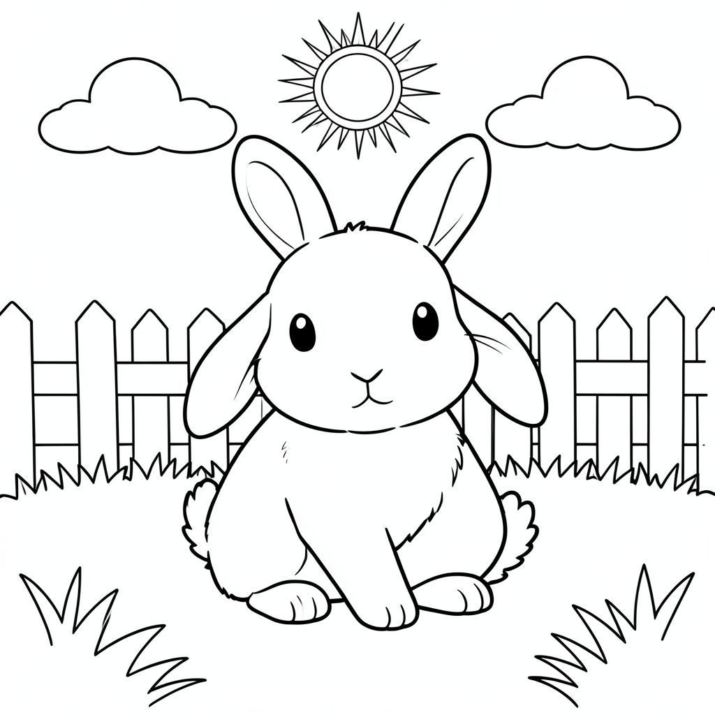 A small white rabbit sits peacefully in a sunlit garden. The rabbit has one round head with long floppy ears, a soft white body, and a tiny fluffy tail. Its ears are positioned on top of its head, and it sits with one front paw gently touching the ground. The garden features a simple wooden fence in the background, soft grass, and a sun shining above. A few white clouds float in the sky. The composition is balanced with the rabbit centered in the scene, surrounded by gentle, cheerful elements. The rabbit's form is outlined in clean, simple lines with no shading or color., coloring page, line art, white background