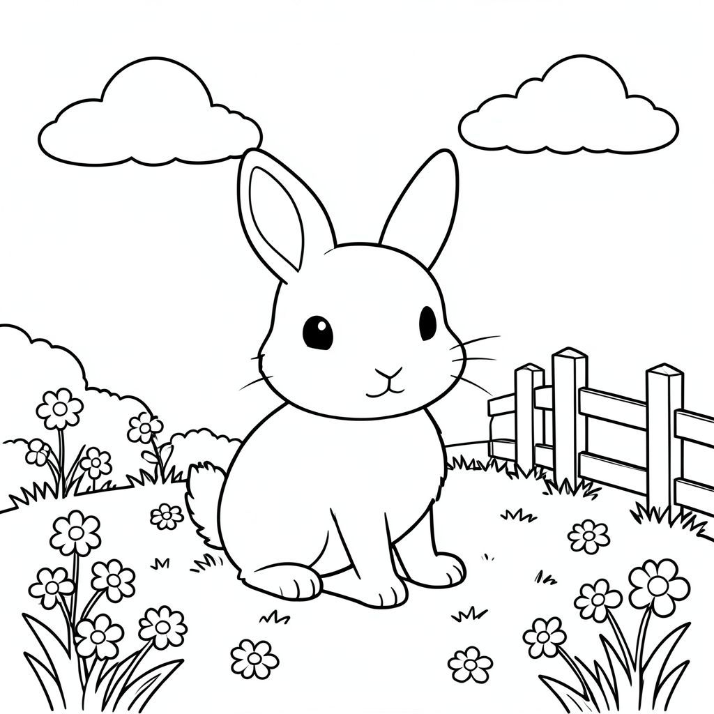 A small white rabbit sits peacefully in a sunlit garden. The rabbit has one round head with long floppy ears, a soft white body, and a tiny fluffy tail. Its ears are positioned on top of its head, and its tail is small and rounded. The rabbit sits on a patch of grass with small flowers scattered around. A few white clouds float in the sky above. The garden has a simple wooden fence on the right side. The composition is balanced with the rabbit centered in the scene, surrounded by gentle elements. The outline is clean and clear, with no shading or color. The rabbit's form is simple and recognizable, with no extra parts or features. The background includes only the sun, clouds, grass, and flowers to create a peaceful, storybook setting., coloring page, line art, white background