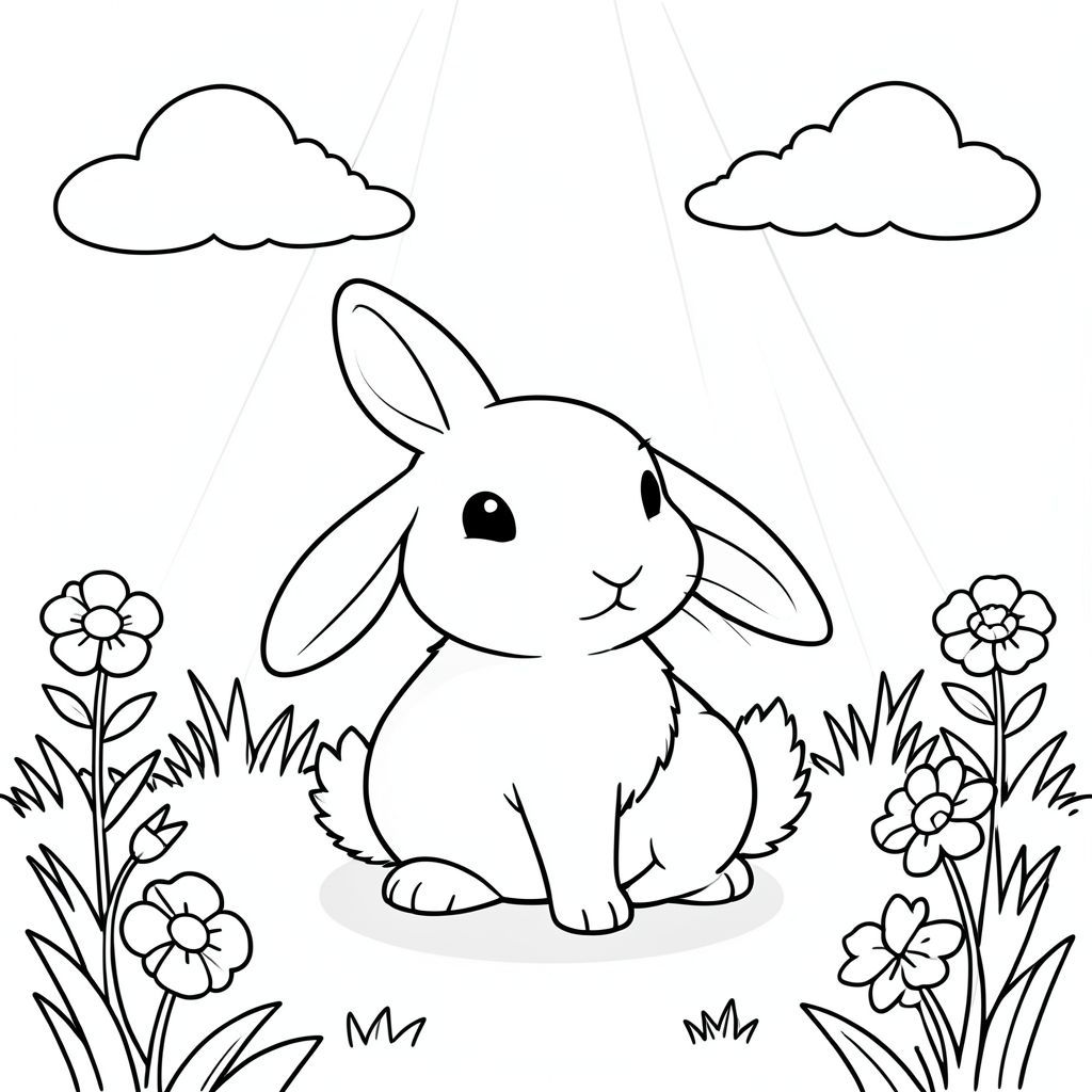 A small white rabbit sits peacefully in a sunlit garden. The rabbit has one round head with long floppy ears, one soft body, and one small fluffy tail. Gentle sun rays shine down from above, casting soft shadows around the scene. A few white clouds drift lazily in the clear sky. The garden features simple grass and a few blooming flowers. The composition is balanced with the rabbit centered in the frame, surrounded by the sunlight and peaceful environment. Clean lines define the rabbit's simple form with no extra details or . The scene maintains a cheerful, innocent atmosphere with no scary or disturbing elements., coloring page, line art, white background