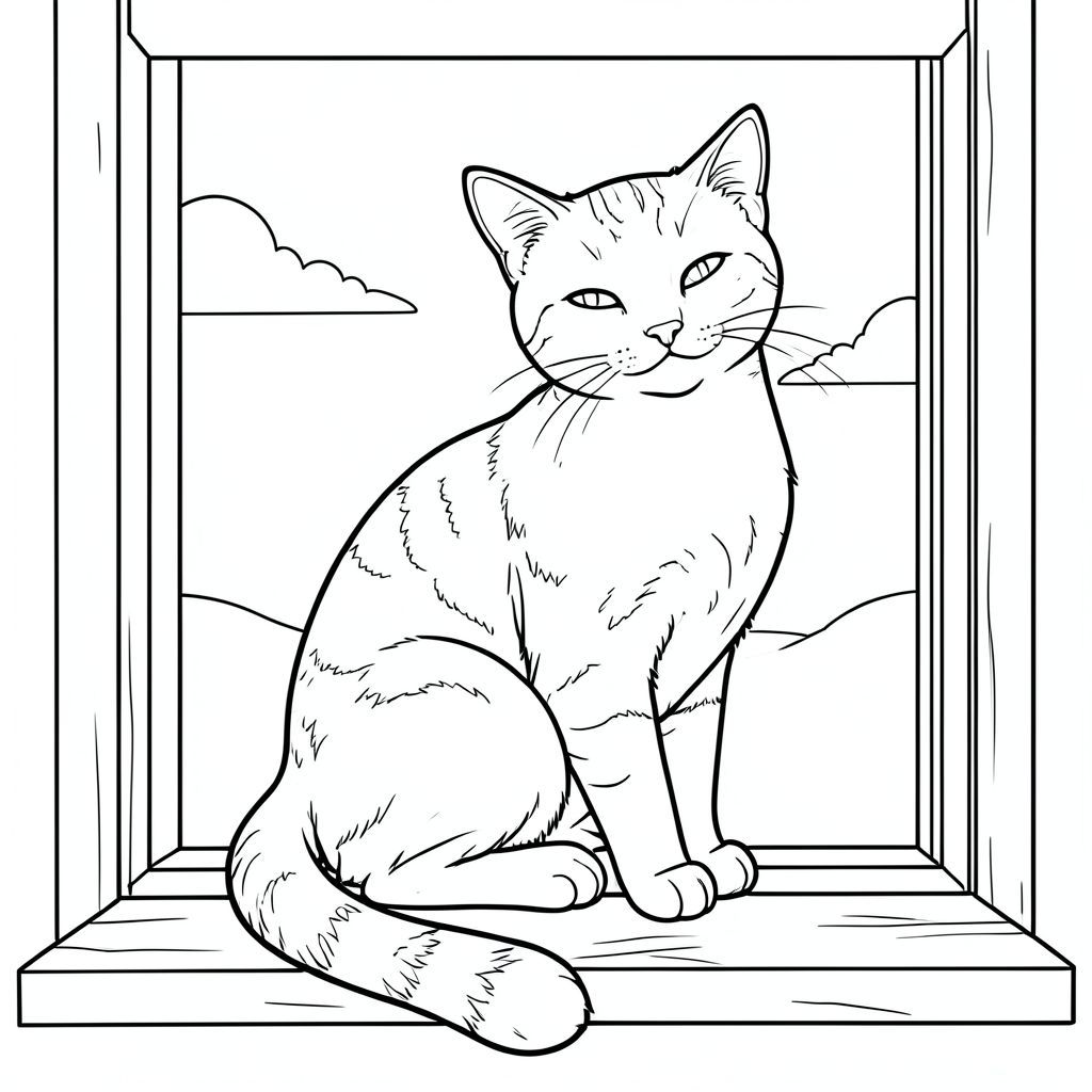 A solitary tabby cat sits perched on a windowsill, its sleek body positioned diagonally across the frame. The cat's head is turned slightly toward the viewer, ears pricked forward, eyes half-closed in contentment. Its tail curls gracefully around the cat's paws, creating a gentle arc that balances the composition. The cat's body is rounded and soft, with distinctive tabby markings clearly visible along its sides and legs. The window behind the cat shows a clear sky with a few white clouds drifting by. The cat's paws rest firmly on the wooden window ledge, and its front claws are gently extended. The overall scene is peaceful and serene, with the cat positioned in the center of the composition, creating perfect visual balance. The background is minimal, showing only the simple window frame and distant sky, allowing the cat's form to be the sole focus of attention. The cat's posture suggests calm curiosity, as if it's observing something interesting outside the window. The clean lines of the illustration emphasize the cat's graceful silhouette against the soft sky background. The composition is perfectly balanced with the cat's body forming a gentle diagonal line that draws the eye across the scene. The window's wooden frame creates natural boundaries that frame the cat's form without overwhelming it. The cat's expression is peaceful, with no signs of tension or alertness, just the quiet satisfaction of a well-fed feline in a comfortable . The entire scene radiates tranquility and gentle warmth., coloring page, line art, white background