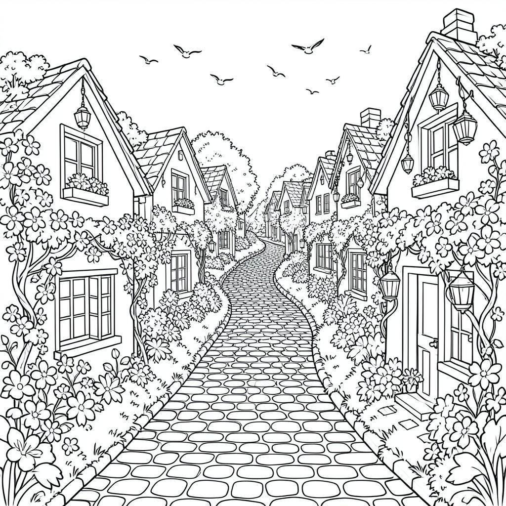 A winding cobblestone road disappearing between many small cottages, every house covered in flowers, hanging lanterns, vines wrapping around windows, birds flying across sky