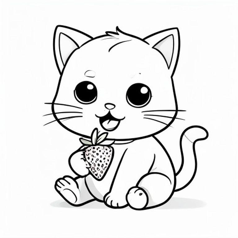 baby cat eating stawberry, happy expression, Kawaii baby cat, big round head, tiny body, short legs, small paws, simple cute pose matching activity, large round eyes, small black nose, cute smile, chubby cheeks, 3 small lines on forehead, simple whiskers,