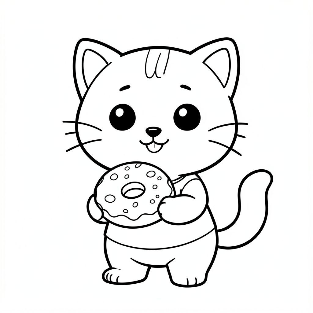 Baby Cat holding a donut, happy expression, Kawaii baby cat, big round head, tiny body, short legs, small paws, simple cute pose matching activity, large round eyes, small black nose, cute smile, chubby cheeks, 3 small lines on forehead, simple whiskers,