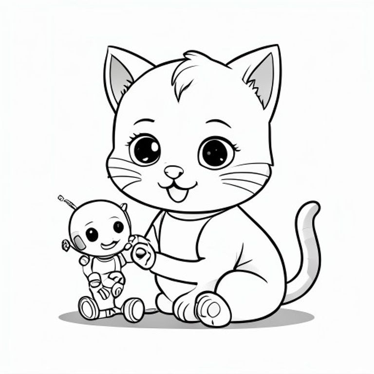 Baby cat interacting with a small cute toy robot, happy expression, Kawaii baby cat, big round head, tiny body, short legs, small paws, simple cute pose matching activity, large round eyes, small black nose, cute smile, chubby cheeks, 3 small lines on forehead, simple whiskers, small ears with inner detail, smooth tail curved, wearing simple shirt, thick bold clean outline, same line weight, no color, no shading, no grayscale, no extra detail, large open spaces, simple white background, kid friendly style, ages 3 to 6 --ar 2:3