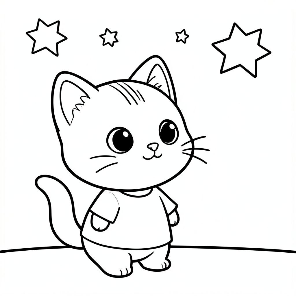 Baby cat looking outside at simple stars in the sky, peaceful night scene, peaceful expression, Kawaii baby cat, big round head, tiny body, short legs, small paws, simple cute pose matching activity, large round eyes, small black nose, cute smile, chubby cheeks, 3 small lines on forehead, simple whiskers, small ears with inner detail, smooth tail curved, wearing simple shirt, thick bold clean outline, same line weight, no color, no shading, no grayscale, no extra detail, large open spaces, simple background, kid friendly style, ages 3 to 6 --ar 2:3