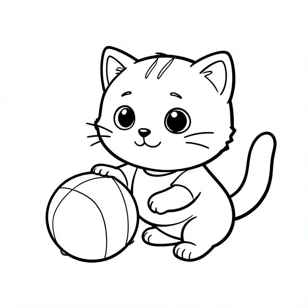 Baby cat playing with a round ball, ball having few lines on it, Kawaii baby cat, big round head, tiny body, short legs, small paws, simple cute pose matching activity, large round eyes, small black nose, cute smile, chubby cheeks, 3 small lines on forehead, simple whiskers,