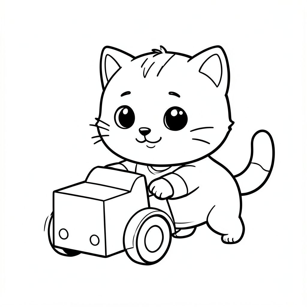 Baby cat pushing a simple toy block car, playful pose, Kawaii baby cat, big round head, tiny body, short legs, small paws, simple cute pose matching activity, large round eyes, small black nose, cute smile, chubby cheeks, 3 small lines on forehead, simple whiskers,
