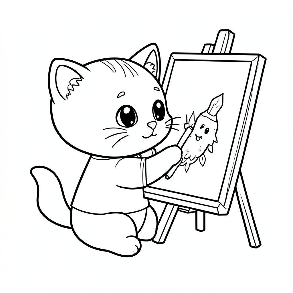 Baby cat sitting and painting on an easel with simple brush and canvas, cute focused expression, having few drawing draw on drawing board, board having proper stand, Kawaii baby cat, big round head, tiny body, short legs, small paws, simple cute pose matching activity, large round eyes, small black nose, cute smile, chubby cheeks, 3 small lines on forehead, simple whiskers,