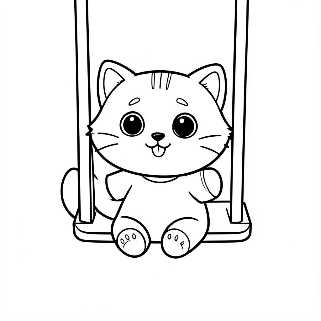 Baby cat sitting on a simple swing, excitment expression, Kawaii baby cat, big round head, tiny body, short legs, small paws, simple cute pose matching activity, large round eyes, small black nose, cute smile, chubby cheeks, 3 small lines on forehead, simple whiskers, small ears with inner detail, smooth tail curved, wearing simple shirt, thick bold clean outline, same line weight, no color, no shading, no grayscale, no extra detail, large open spaces, simple background, kid friendly style, ages 3 to 6 --ar 2:3