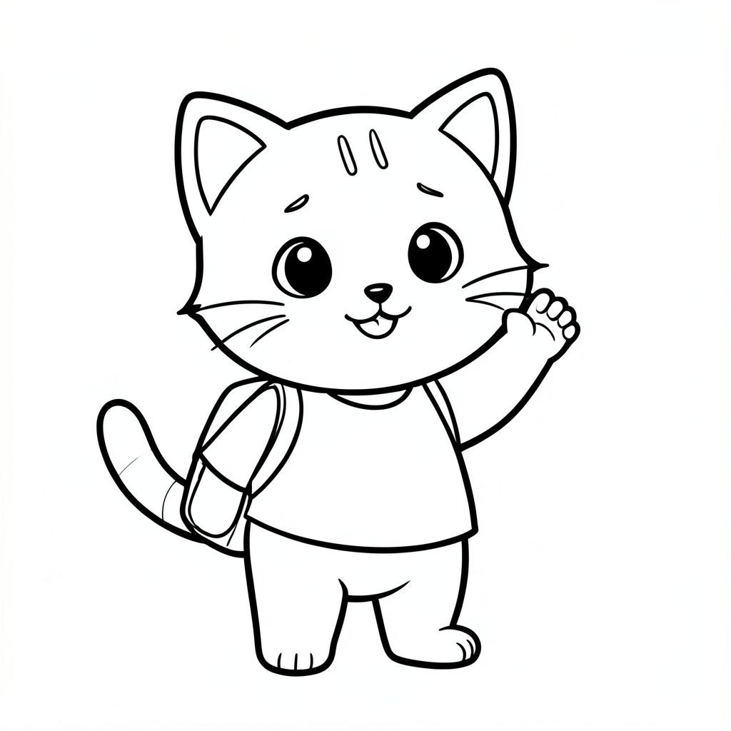 Baby cat standing and waving hand happily to school friends, school bag on back, simple friendly pose, Kawaii baby cat, big round head, tiny body, short legs, small paws, simple cute pose matching activity, large round eyes, small black nose, cute smile, chubby cheeks, 3 small lines on forehead, simple whiskers, small ears with inner detail, smooth tail curved, wearing simple shirt, thick bold clean outline, same line weight, no color, no shading, no grayscale, no extra detail, large open spaces, simple background, kid friendly style, ages 3 to 6 --ar 2:3