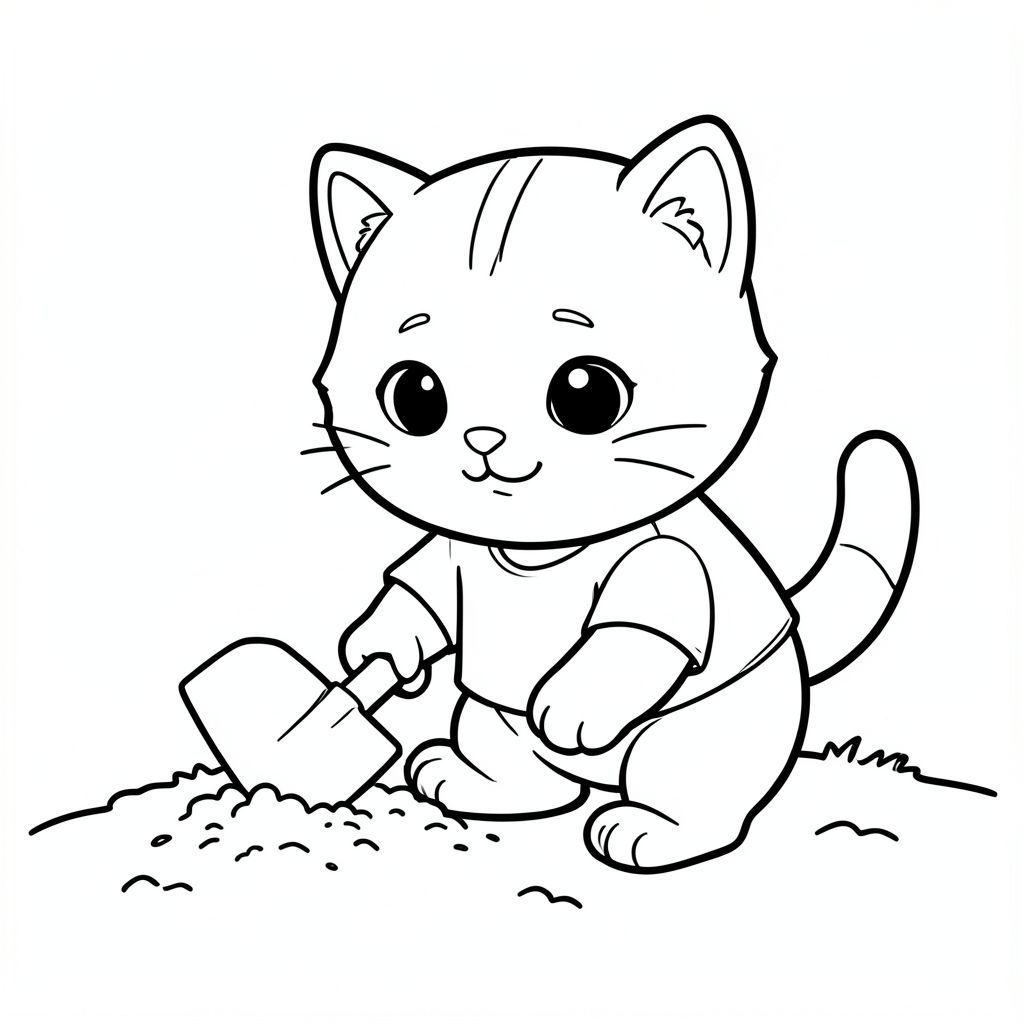 Baby cat using a small shovel to dig in the soil, cute focused expression, hand must be clear, clean, visible, Kawaii baby cat, big round head, tiny body, short legs, small paws, simple cute pose matching activity, large round eyes, small black nose, cute smile, chubby cheeks, 3 small lines on forehead, simple whiskers,