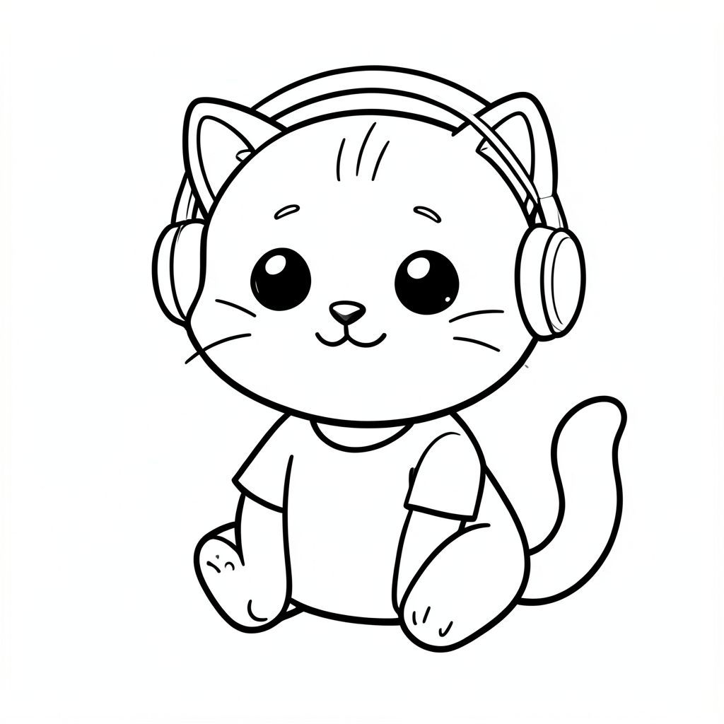 Baby cat wearing simple headphones, sitting relaxed and happy, Kawaii baby cat, big round head, tiny body, short legs, small paws, simple cute pose matching activity, large round eyes, small black nose, cute smile, chubby cheeks, 3 small lines on forehead, simple whiskers,