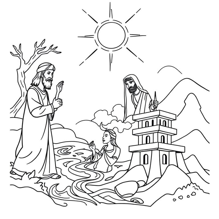 "Biblical coloring page divided into 5 sections: creation, Adam and Eve, the fall, the flood, Tower of Babel."