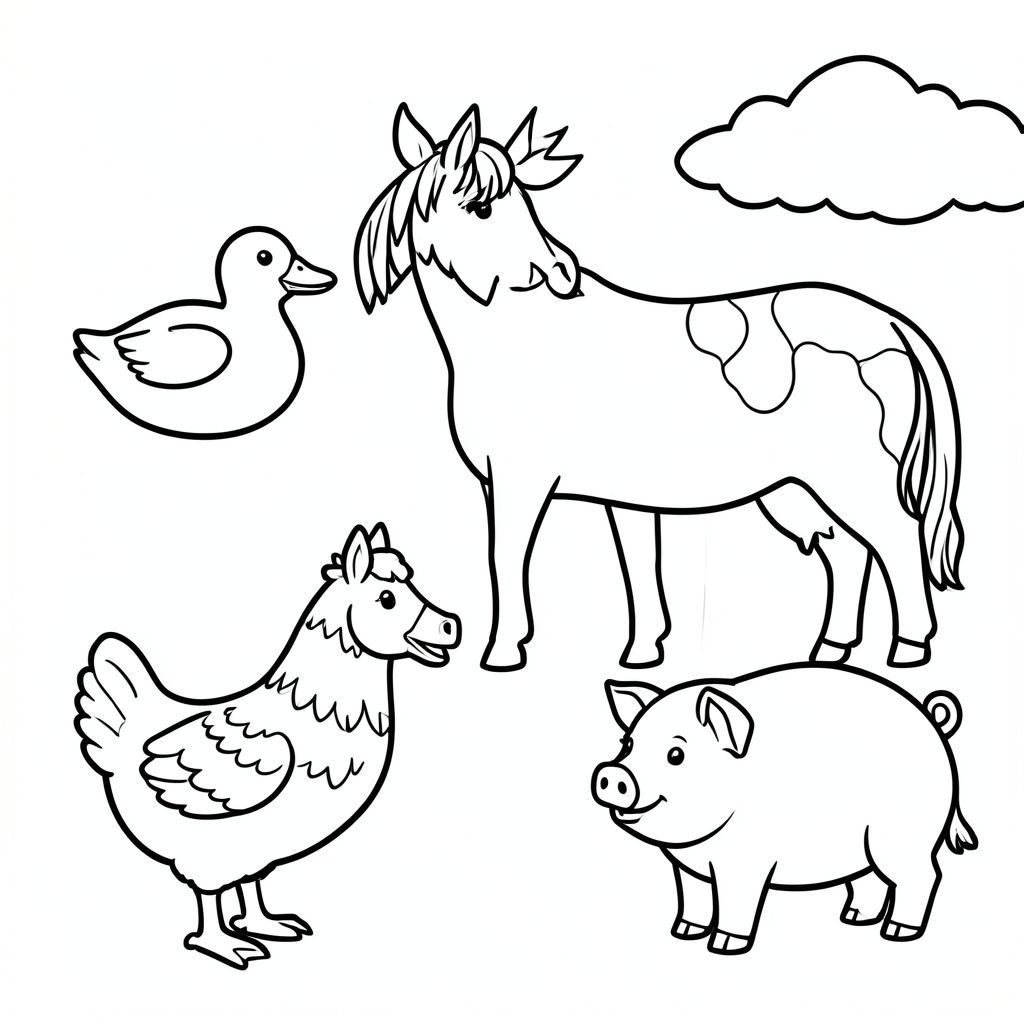 Black and white coloring page for kids ages 3-5, very simple educational style, thick bold outlines, no shading, no gray, a duck, a horse, a cow, a hen, and a pig, in a farm. minimal details, friendly expression, clean white background, vector style, printable A4, children’s coloring book page. Pay attention to each animal, they have to be perfectly draw