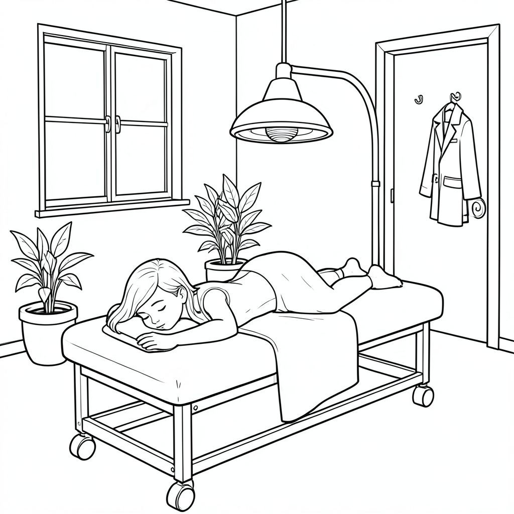 Black-and-white line art coloring page of a peaceful treatment room. A woman lies face down on a massage table with a sheet drape covering her lower back legs and feet and her face in a face cradle. Her back is exposed. An infrared lamp hovers above her back. The room has a window, a rolling treatment table, a few potted plants, a chair with clothes on it, a door with a hook, and a coat hanging on the hook. Simple, clear outlines suitable for coloring, calm and relaxing atmosphere, all elements visible and easy to color.