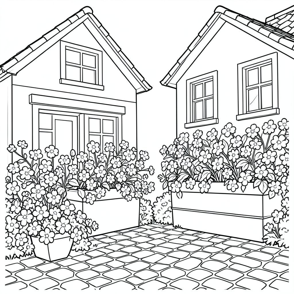 Close-up of two neighboring houses with large flower boxes overflowing with blossoms, cobblestones below. Full of elements to color. A lot of things to color.